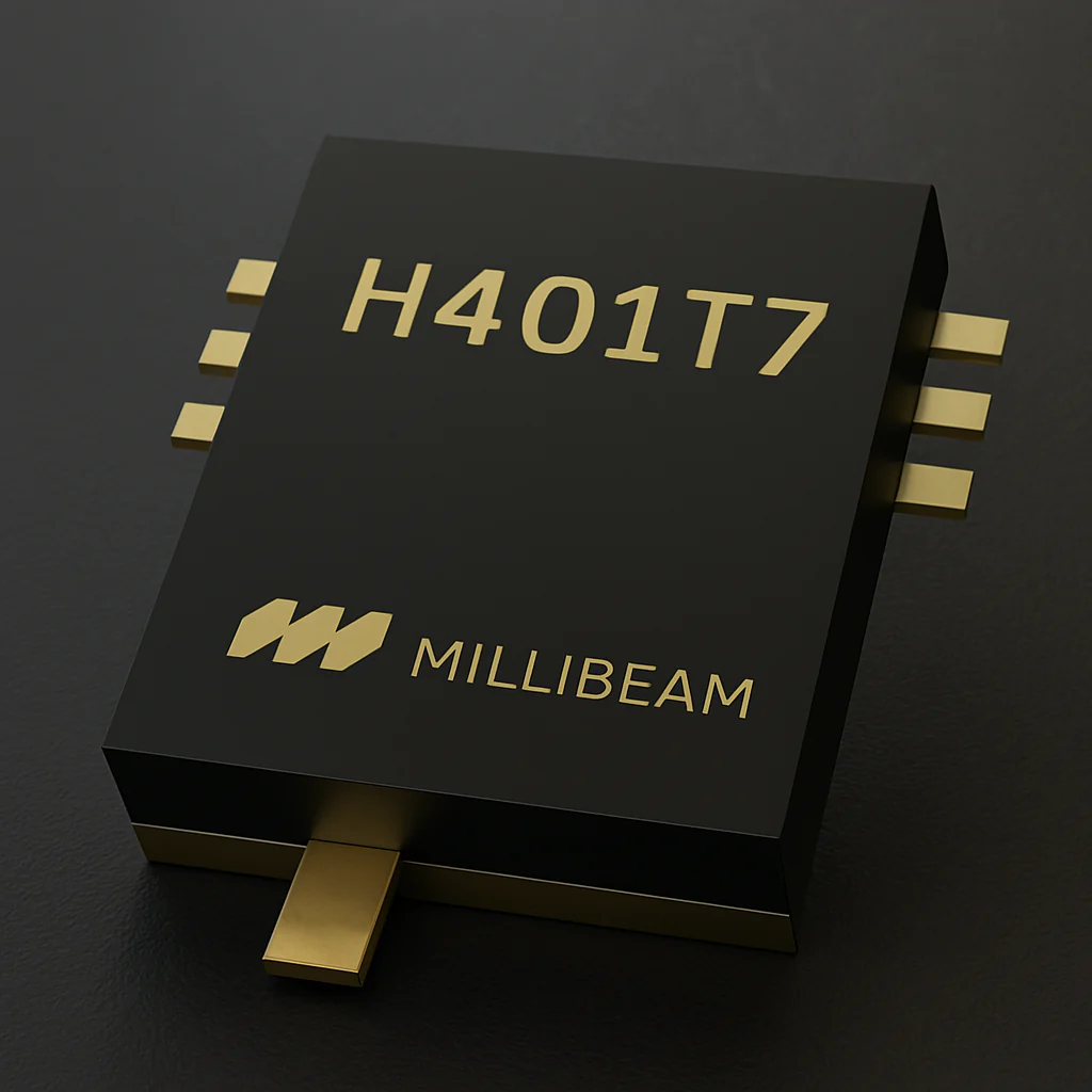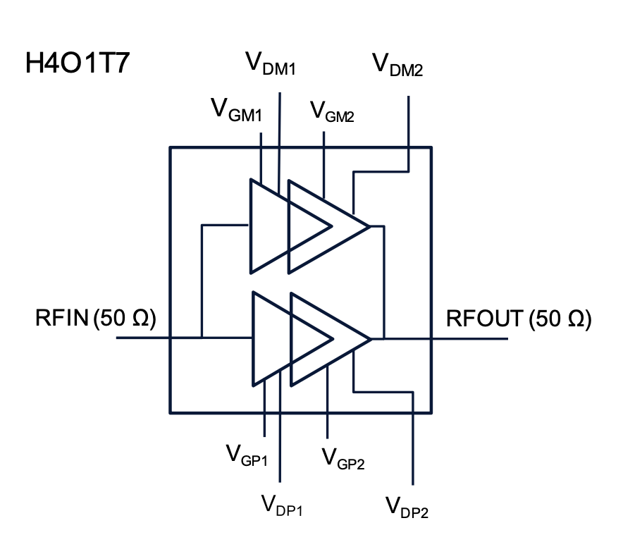 The H4O1T7 is a GaN Doherty power amplifier module delivering 100 W Psat across the 2.5–2.7 GHz 5G NR n41 band. It achieves ~38% average PAE at 8 dB back-off with ACPR of -30 dBc and EVM of ~5%, supporting 100 MHz signal bandwidth and 2× 100 MHz carrier aggregation. No external matching required.